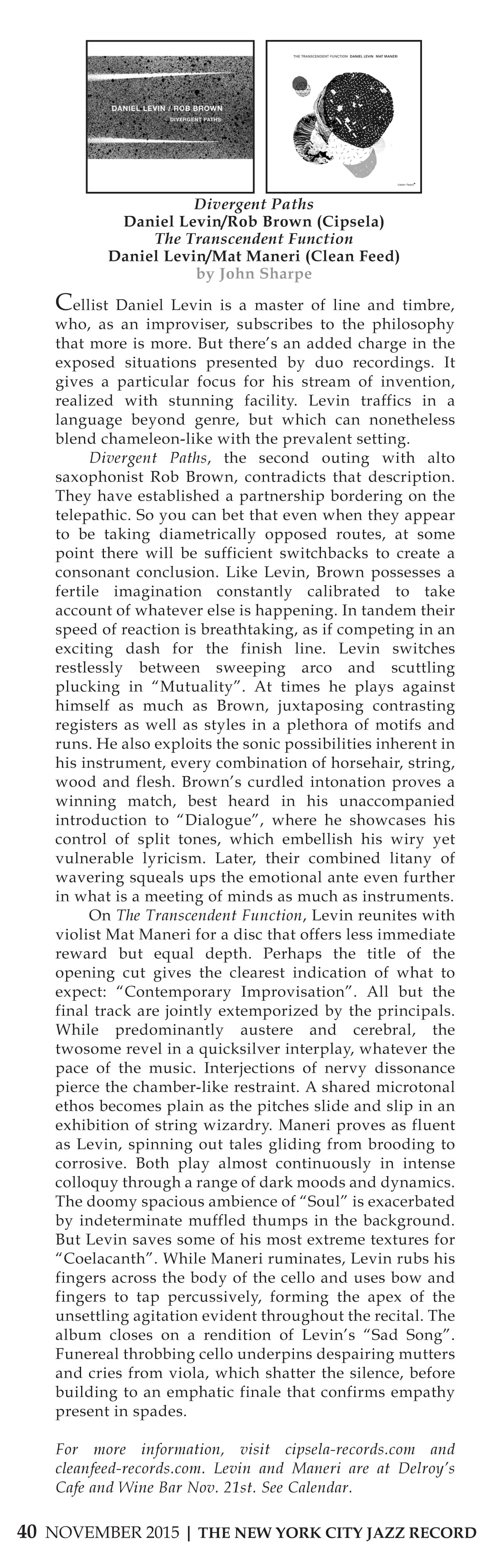 Home CD's reviews New York City Jazz Records – Daniel Levin / Mat Maneri – The Transcendent Function By Madalena. Published on November 24, 2015. 0 By John Sharpe Buy + There are no comments Add yours Cancel reply CommentNameEmailUrl This site uses Akismet to reduce spam. Learn how your comment data is processed.